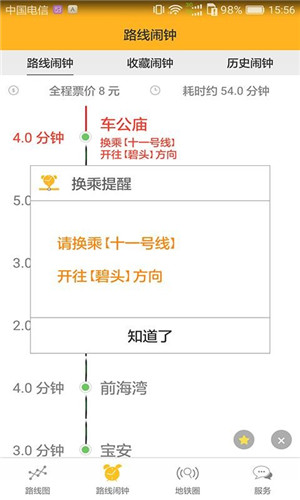 (3)根據(jù)開啟規(guī)劃好的線路提前設(shè)定到站地鐵鬧鈴,到站前及時以震動+鈴聲的方式提醒您,并根據(jù)需要可以自定義自己喜歡的鬧鈴。