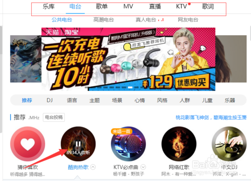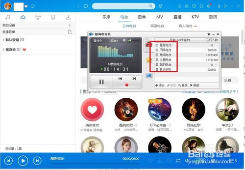 2、打開酷狗收機(jī)后,打開你經(jīng)常收聽的廣播電臺(tái),一般先選擇電臺(tái)類型(網(wǎng)絡(luò)電臺(tái)、地域電臺(tái)等),選擇類型展開后就找到你收聽的電臺(tái)就可以了。