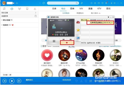 3、點(diǎn)擊打開自己要錄音的廣播電臺(tái)后,點(diǎn)擊收音機(jī)主界面的錄音按鈕(紅色圓圈按鈕),這時(shí)就會(huì)自動(dòng)錄音,并且也在右邊顯示保存的電臺(tái),一般命名方式以電臺(tái)名稱+錄音時(shí)間。