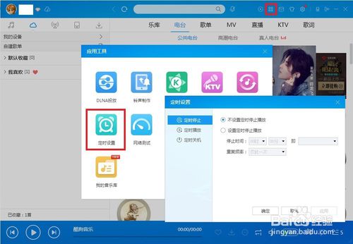 5、調(diào)出定時(shí)設(shè)置工具:當(dāng)無法手動(dòng)關(guān)閉錄音,也可設(shè)置定時(shí)關(guān)機(jī),點(diǎn)擊酷狗播放器主界面右上角的工具——點(diǎn)擊定時(shí)設(shè)置,就會(huì)彈出設(shè)置界面。
