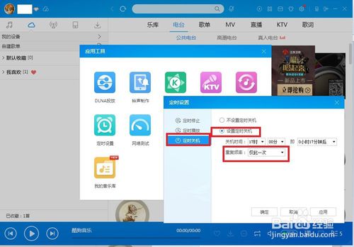 6、設(shè)置定時(shí)關(guān)機(jī):先算一下你要錄音的節(jié)目什么時(shí)候結(jié)束,然后在定時(shí)設(shè)置界面那里點(diǎn)擊:定時(shí)關(guān)機(jī)——設(shè)置定時(shí)關(guān)機(jī)——然后設(shè)置關(guān)機(jī)時(shí)間,重復(fù)頻率選擇:僅此一次。這樣就會(huì)在節(jié)目結(jié)束時(shí),酷狗也會(huì)自動(dòng)關(guān)機(jī)了。