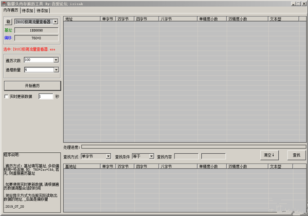 玩游戲應(yīng)該有很多都會(huì)遍歷內(nèi)存啥的,龍龍的內(nèi)存遍歷工具有時(shí)候多了會(huì)異常,且查找數(shù)據(jù)每次都要遍歷,有點(diǎn)麻煩,就自己做了個(gè)簡易版,為了查找方便點(diǎn),基址框填基址,偏移用+號(hào)連接,具體看圖,如果偏移欄為空,則遍歷基址本身地址,程序易語言編寫,北斗壓縮了一下,五毒無廣告,輕巧又效率,后續(xù)可能會(huì)添加其余功能。