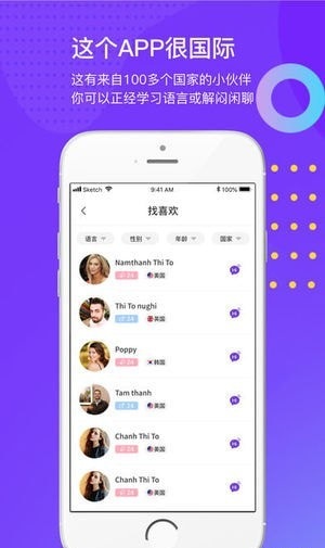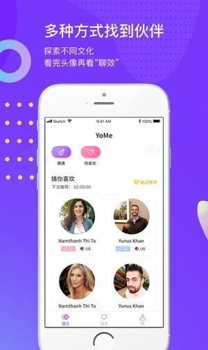 YoMe app可以根據(jù)你的需求包括母語,學習語言,地區(qū)分布,年齡,性別等篩選條件,為你自動匹配最合適的理想語伴。