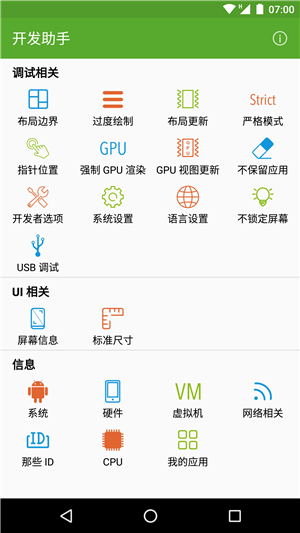 1. 快速打開或關(guān)閉開發(fā)者選項中的選項。將原來幾十秒的操作縮短為一次點擊。包括顯示布局邊界、顯示 GPU 過度繪制、顯示布局更新、強制 GPU 渲染、顯示 GPU 視圖更新、顯示指針位置、嚴(yán)格模式、不保留活動、不鎖定屏幕。每個工具可以通過長按工具圖標(biāo)添加快捷方式到桌面,以后連打開 App 都省了。