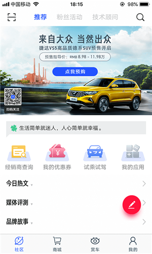 JETTA捷達(dá)app是一款一汽大眾捷達(dá)品牌車主app,JETTA捷達(dá)app是專為大眾汽車粉絲或者用戶們打造的綜合服務(wù)應(yīng)用,JETTA捷達(dá)app匯聚了眾多車友發(fā)布的動(dòng)態(tài)信息,讓你看到大眾汽車之美;眾多相關(guān)資訊文章讓你看到大眾汽車品牌的獨(dú)特姿態(tài)。