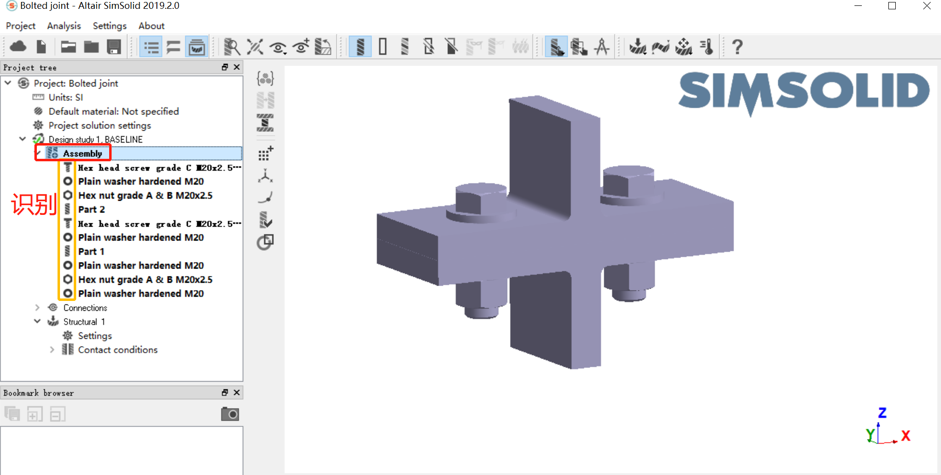 通過(guò)上述步驟,我們看到SimSolid可以為螺栓創(chuàng)建合適的接觸。這是為什么呢?展開(kāi)模型樹(shù)Design study 1,BASELINE>Assembly可知每個(gè)部件前有個(gè)識(shí)別符號(hào)(如下圖)。這是因?yàn)橐坏?dǎo)入幾何,根據(jù)圓柱形主體和頭部外徑或內(nèi)徑上的六角形,SimSolid可以識(shí)別該幾何體為螺栓。使用這種基于六角形的幾何特征,以類似的方式識(shí)別螺母。