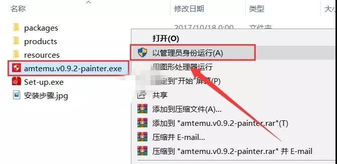 16.打開之前解壓后的【PS2018 X64bit】文件夾,選中【amtemu.v0.9.2-painter】可執(zhí)行文件,鼠標(biāo)右擊選擇【以管理員身份運(yùn)行】。溫馨提示:若打開后沒有amtemu.v0.9.2-painter文件,則需要關(guān)閉你電腦殺毒軟件和防火墻后再重新解壓安裝包后打開。