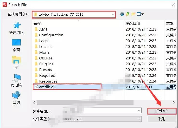 18.查找范圍就去之前粘貼后的磁盤找【Adobe Photoshop CC 2018】文件夾,然后選擇【amtlib.dll】文件后點(diǎn)擊【打開】。