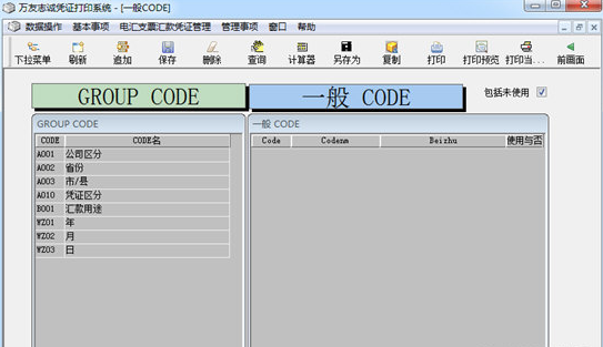 點擊“查詢”按鈕,左邊顯示登記的內(nèi)容,點擊左邊GROUP CODE欄,右邊一般CODE欄顯示該GROUP CODE 對應(yīng)的一般CODE。此處不要隨意添加、刪除。