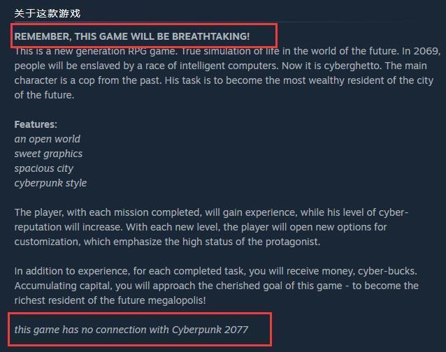 開發(fā)者在商店說明中強調(diào)“本作與《賽博朋克2077》”無關(guān),但本作不僅在名稱上與《賽博朋克2077(Cyberpunk 2077)》頗為類似,另外開發(fā)者在介紹中也表示這是款”Breathtaking”的游戲作品。