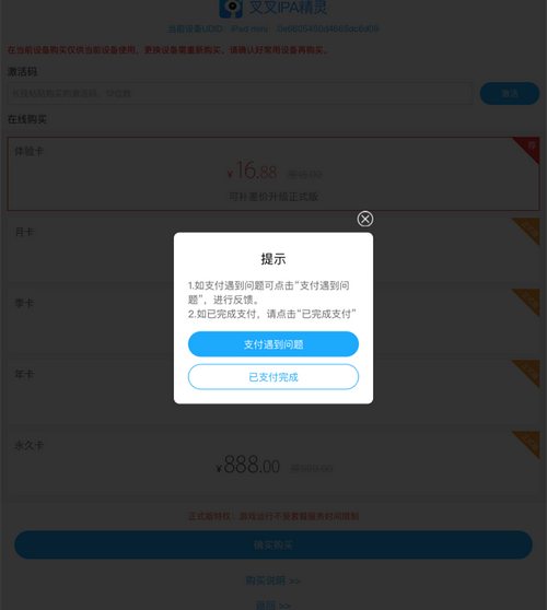 叉叉IPA精靈需要購買套餐才能安裝并使用,購買時(shí)需捆綁唯一設(shè)備號,在該設(shè)備上進(jìn)行使用。目前安裝過程中跳去系統(tǒng)設(shè)置“安裝描述文件”的步驟可以理解成獲取當(dāng)前設(shè)備號。