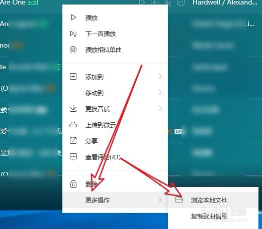 右鍵點擊該音樂的快捷鏈接,在彈出菜單中選擇“更多操作/瀏覽本地文件”菜單項。