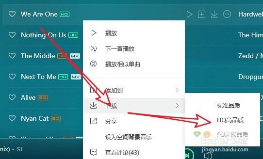 右鍵點擊該音樂快捷鏈接,在彈出菜單中依次點擊“下載/下載品質(zhì)”菜單項。