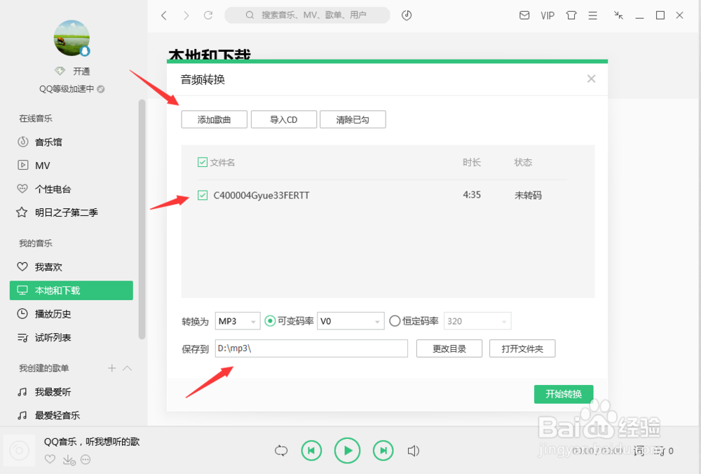 在彈出的音頻轉(zhuǎn)碼對話框中,選擇“添加歌曲”,然后設(shè)置好轉(zhuǎn)換文件的保存位置后,點擊“開始轉(zhuǎn)換”按鈕對歌曲進行轉(zhuǎn)換。
