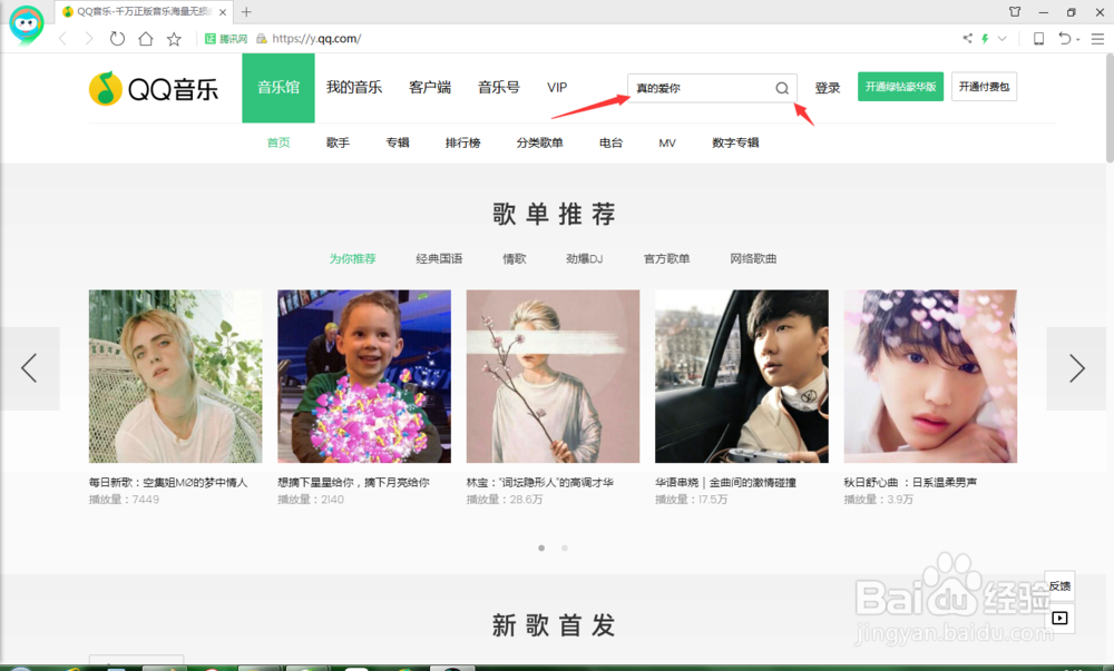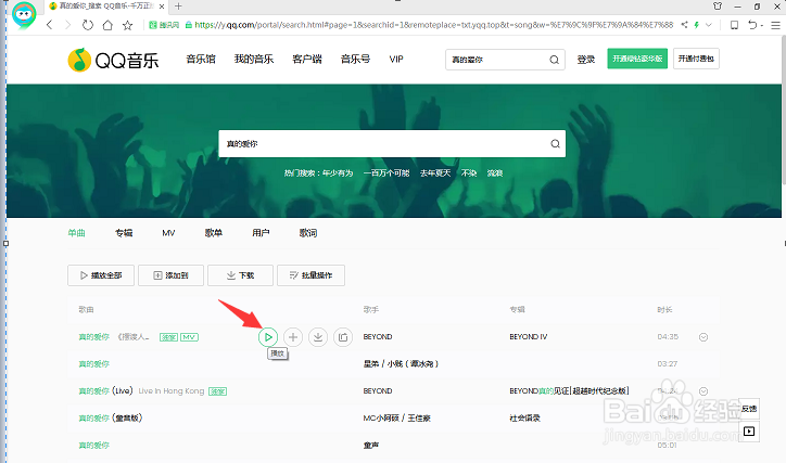 假如我們要下載BEYOND的"真的愛你“這首歌曲,在QQ音樂首頁的搜索框中輸入"真的愛你“并搜索。