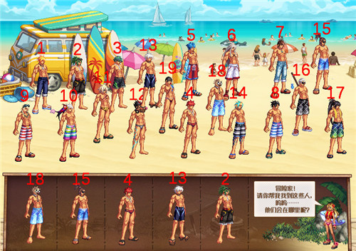首先夏日海灘活動(dòng)的本體類似于找不同,勇士們需要根據(jù)提供的5位人物外形來(lái)在人群中找到對(duì)應(yīng)的角色,時(shí)間內(nèi)全部找到就可以獲得獎(jiǎng)勵(lì)了。