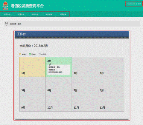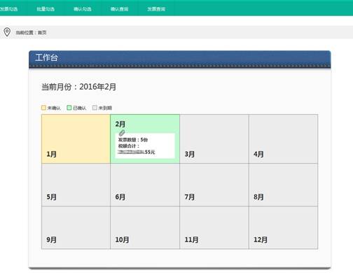 界面介紹:主頁面中分成如下4大板塊,主要功能菜單包括:發(fā)票勾選、批量勾選、確認(rèn)勾選、確認(rèn)查詢等功能菜單,頁面中間有個工作臺,用戶可以看到當(dāng)前年度內(nèi)各月增值稅進(jìn)項發(fā)票的勾選確認(rèn)情況,根據(jù)勾選確認(rèn)的操作情況在工作臺區(qū)域會有三種顏色來標(biāo)識不同的業(yè)務(wù)狀態(tài):橙色底色,綠色底色,灰色底色