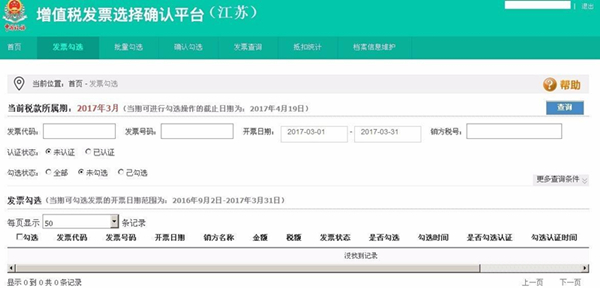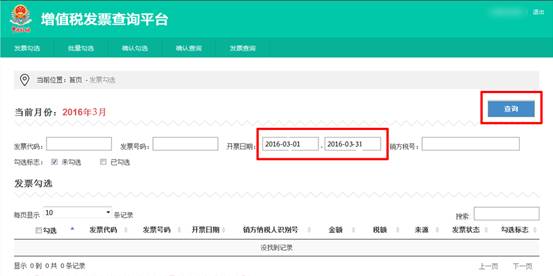 3.點擊菜單【發(fā)票勾選】,主界面跳轉(zhuǎn)到發(fā)票勾選功能模塊,選擇開票的起始結(jié)束日期,本例子選取的是3月份的時間,點擊查詢按鈕查詢