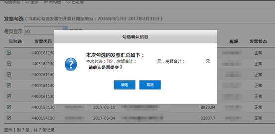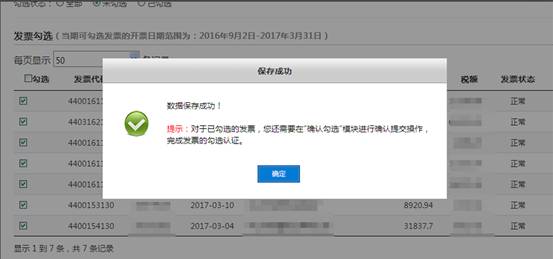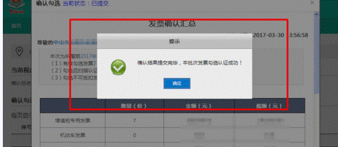 5.彈出勾選確認(rèn)信息,再次確認(rèn)金額稅額有無錯誤,然后點擊確認(rèn),再次彈出提示數(shù)據(jù)提交成功的對話框,再點擊確認(rèn),勾選發(fā)票成功