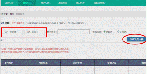 6.如果你的發(fā)票數(shù)據(jù)量夠多,請點擊【批量勾選】功能模塊,點擊”下載發(fā)票文件“按鈕,可下載一個包含當(dāng)前所有發(fā)票狀態(tài)為正常且未確認(rèn)的發(fā)票清單文件。