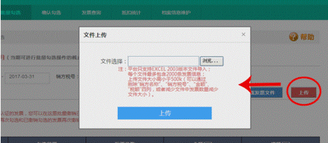 7.完成上步驟后,回到批量勾選界面,點擊上傳按鈕,點擊瀏覽,在彈出的對話框中,在文件目錄中選擇已另存為的EXCEL文件,點擊打開,回到原上傳頁面,點擊上傳,完成批量勾選處理