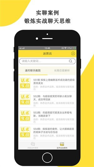 6、迷男說app提供各種實(shí)聊案例,鍛煉你的聊天思維,成為個(gè)有趣的人。
