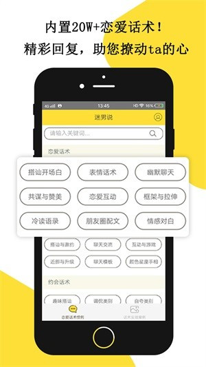 1、豐富話術(shù)迷男說app內(nèi)置20W+聊天話術(shù),你根本不需要去學(xué)習(xí)聊天!遇到不知道怎么回復(fù)時(shí)搜一下,N+精彩回復(fù)供您選擇。