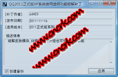 QQ2011正式版系統(tǒng)透明功能破解補丁是qq2011透明皮膚補丁破解軟件,破解皮膚模塊,xp系統(tǒng)不用外掛也可使用透明功能。