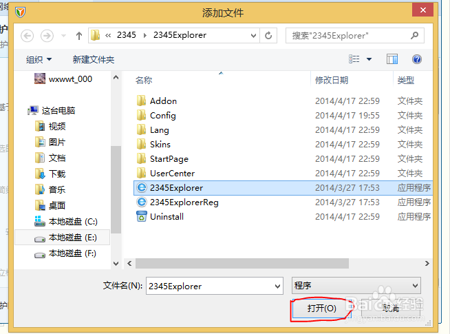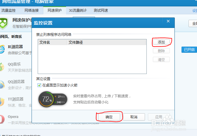 在點(diǎn)擊”設(shè)置“按鈕后彈出的對話框下,點(diǎn)擊”添加“按鈕,在彈出的對話框里選擇想要禁用聯(lián)網(wǎng)的程序,點(diǎn)擊”打開“添加到禁用列表,點(diǎn)擊”確定“完成操作。(如圖所示)