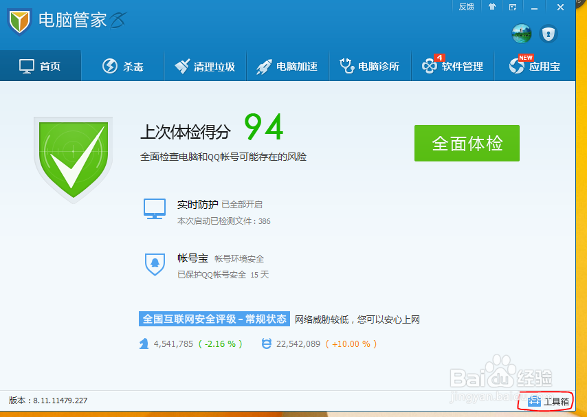 啟動(dòng)“騰訊電腦管家”,點(diǎn)擊主界面右下角的“工具箱”(如圖所示)