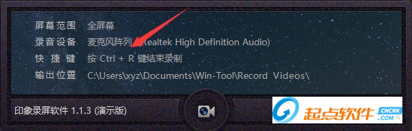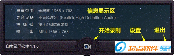 主界面印象錄屏軟件的主界面采用非常簡(jiǎn)潔的中控臺(tái)設(shè)計(jì),在主要部分實(shí)時(shí)顯示當(dāng)前用戶設(shè)置的錄制信息,包括屏幕范圍、錄音設(shè)備、快捷鍵和輸出信息等。