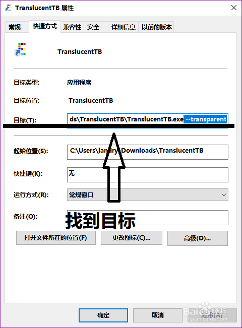 在屬性窗口下找到:“目標(biāo)”,在最后面加上一個(gè)空格,再輸入--transparent,之后點(diǎn)擊應(yīng)用、確定即可
