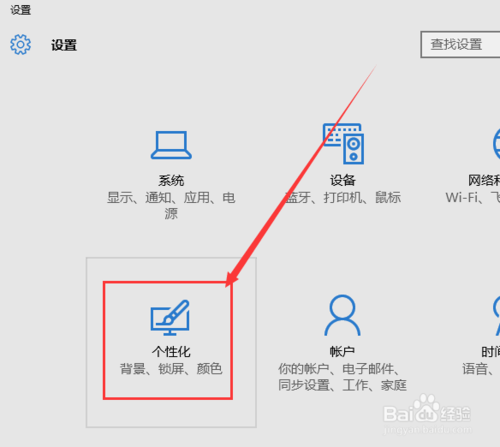 進(jìn)入Win10系統(tǒng)設(shè)置頁面之后,我們點(diǎn)擊打開Win10系統(tǒng)中的“個(gè)性化”菜單設(shè)置頁面,點(diǎn)擊即可進(jìn)入系統(tǒng)主題個(gè)性化設(shè)置頁面。