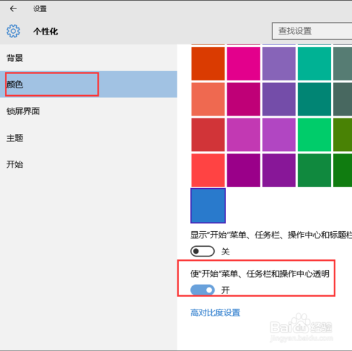 進(jìn)入系統(tǒng)個(gè)性化菜單設(shè)置頁面中以后,點(diǎn)擊頁面左側(cè)的“顏色”選項(xiàng),確保該菜單欄目設(shè)置下,我們將系統(tǒng)的任務(wù)欄保持透明的開關(guān)處于開啟狀態(tài)。