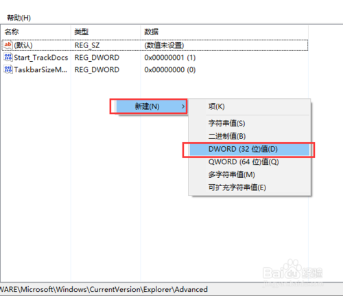接下來,我們對(duì)著打開的Advanced子項(xiàng)右側(cè)頁面擊右鍵,在彈出的菜單中選擇“新建-DWORD(32位)值”。