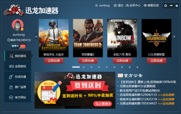 迅龍加速器是一款專門為網(wǎng)絡(luò)游戲研發(fā)的加速器軟件。迅龍加速器能夠幫助用戶連接各種外服游戲,并且徹底解決延遲高、頻繁掉線等網(wǎng)絡(luò)問題,為用戶創(chuàng)造一個快速穩(wěn)定的游戲網(wǎng)絡(luò)環(huán)境,另外迅龍加速器還有超長的免費試用時間,有需要的用戶可以來試試這款加速器。迅龍加速器擁有自主研發(fā)的智能游戲加速系統(tǒng),幾百個加速節(jié)點覆蓋全球各地,讓用戶獲得最好的加速體驗。迅龍加速器還為用戶提供三天的免費超級會員體驗,用戶覺得滿意之后可以再購買。