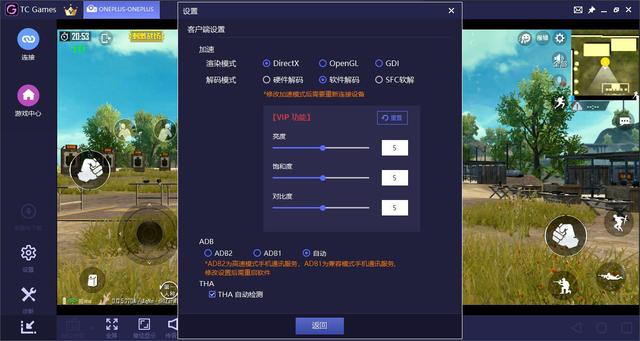 9、根據(jù)個(gè)人需求點(diǎn)擊tcgames右端設(shè)置按鈕對(duì)投屏游戲的畫質(zhì)、分辨率、亮度進(jìn)行設(shè)置,主要在“手機(jī)設(shè)置”和“客戶端設(shè)置”里面進(jìn)行調(diào)試: