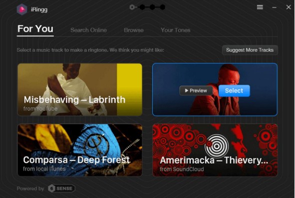 iRingg幾乎可以將您從互聯(lián)網(wǎng)找到的任何聲音制作為個性化鈴聲,操作簡單,簡單幾秒即可完成鈴聲制作,十分好用。還可以添加聲音效果或錄制自己的聲音并使用濾鏡創(chuàng)建極個性化的鈴聲,然后將鈴聲直接推送至iPhone(有線或無線連接),并且制作好的鈴聲會顯示在默認鈴聲里面。傳統(tǒng)的鈴聲制作軟件只會讓你提供 mp3 或 m4r 源文件,然后拖入其中進行編輯導(dǎo)出,iRingg 除了能幫你剪輯音頻,還給用戶提供了選擇歌曲源的渠道:啟動 iRingg,主界面 For You 界面會根據(jù)用戶本機音樂文件的風(fēng)格來判斷用戶的視聽口味,并從音源挑取音頻或視頻文件推送給用戶,這就是前面提到的 6-Sense 技術(shù)… 選擇一個進行鈴聲編輯記錄(如果沒有遇到喜歡的歌曲,可以單擊右上角的“Suggest More Tracks”換一批推薦歌曲)