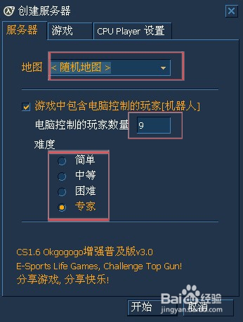 在“服務(wù)器”選項(xiàng)下設(shè)置游戲地圖,電腦控制人數(shù)(機(jī)器人),游戲難度