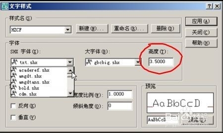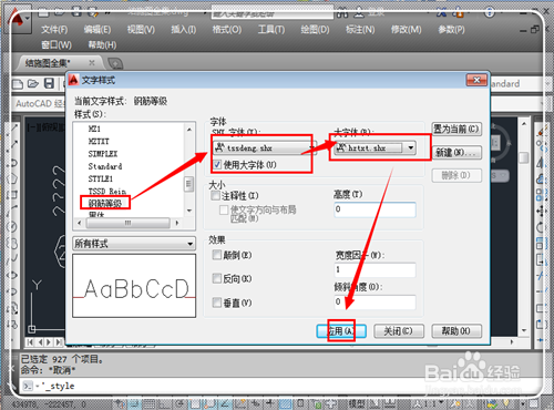 在左中,點(diǎn)擊選中剛才新建的樣式“鋼筋等級”,然后在“字體”中選擇喜歡的,當(dāng)然,最好現(xiàn)則常用的,不然有些是容易顯示問好的,勾上下方的“使用大字體”,然后在右方,選擇一個大字體,點(diǎn)擊“應(yīng)用”。關(guān)閉文字樣式對話框。