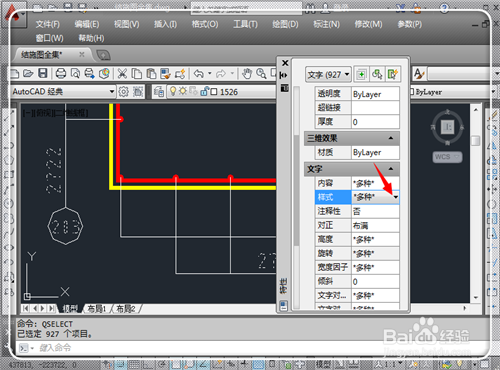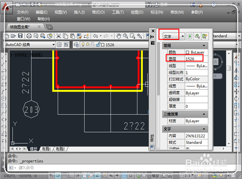進(jìn)入特性表之后,這里需要記住三個重要信息,一個是最上方的“文字”(當(dāng)然你的可能是其他的,以你的為準(zhǔn)),然后是“圖層”后面的“1526”(你的可能不同,以你的名稱為準(zhǔn))。點(diǎn)擊一下esc鍵去掉文字選中。