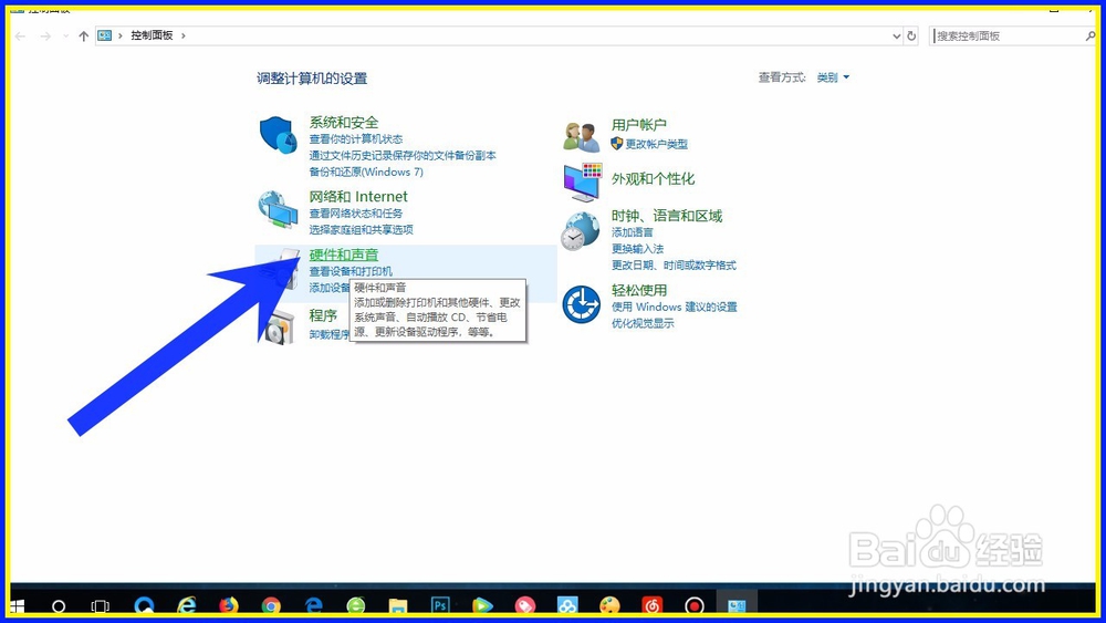接著我們點(diǎn)擊控制面板上面的硬件和聲音,如下圖所示。