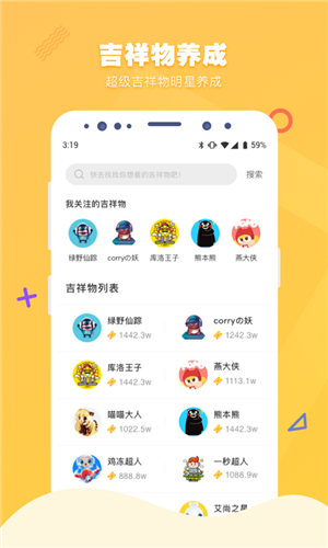 用戶在吉祥大會(huì)app可以看到最受歡迎的吉祥物,可以關(guān)注自己喜歡的吉祥物,查看吉祥物的個(gè)人主頁和動(dòng)態(tài)。
