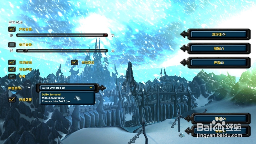如果游戲出錯(cuò)時(shí),默認(rèn)的驅(qū)動(dòng)是Miles Emulated 3D,則在“聲音驅(qū)動(dòng)”中,把它改為第二項(xiàng)Dolby surround或者第三項(xiàng)Creative Labs EAX2(tm)??傊?,如果一個(gè)聲音驅(qū)動(dòng)老是出錯(cuò),就換成另外一個(gè)試試。而且,關(guān)閉所有音效進(jìn)行游戲會(huì)大大降低出錯(cuò)的概率。