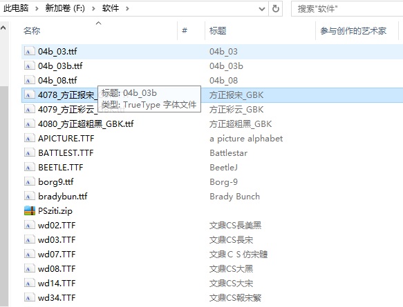 方正報(bào)宋_GBK.TTF、方正彩云_GBK.ttf、方正超粗黑_GBK.ttf、華康海報(bào)體W12(P).ttf、華康寶風(fēng)體.ttf、華康布丁體.ttf、華康布丁體W7(P).ttf、文鼎CS大黑繁.ttf、APICTURE.TTF、BATTLEST.TTF、