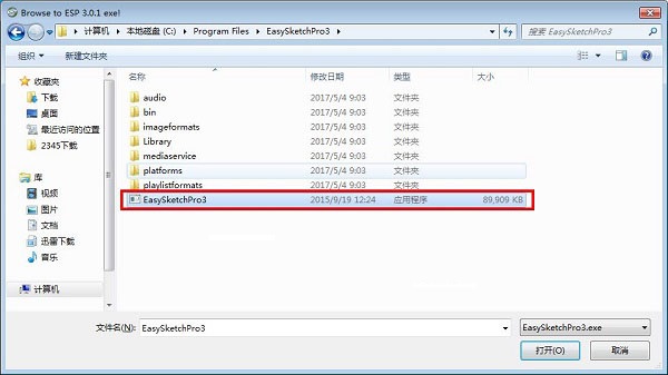 4. 進(jìn)入程序的安裝路徑,默認(rèn)路徑為C:\Program Files\EasySketchPro3,選中EasySketchPro3.exe,并點(diǎn)擊打開(kāi)