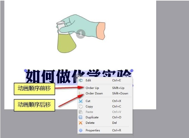 如果想修改多個(gè)元素之間的動(dòng)畫(huà)順序的話,可雙擊后、通過(guò)右鍵菜單的“Order Up(動(dòng)畫(huà)順序前移)”和“Order Down(動(dòng)畫(huà)順序后移)”來(lái)實(shí)現(xiàn)。