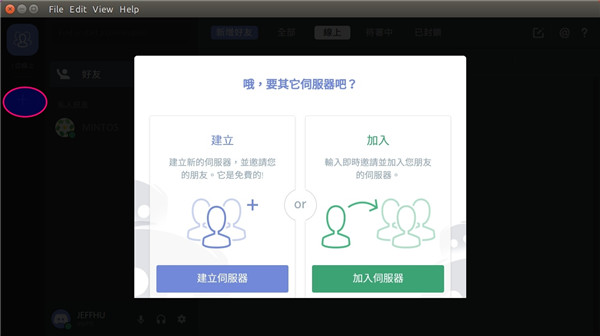 如圖所示,在 Discord 界面左側(cè),點(diǎn)擊大大的加號(hào),彈出窗口詢問“建立伺服器”或“加入伺服器”,你可以簡(jiǎn)單理解為“創(chuàng)建群”還是“加入群”。