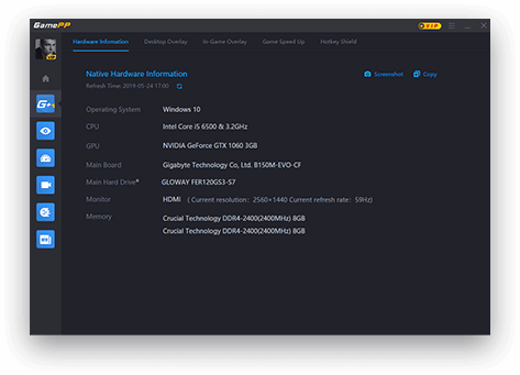 自動檢測電腦操作系統(tǒng)、處理器、顯卡、主板、主硬盤、顯示器、內(nèi)存的詳細(xì)硬件信息,準(zhǔn)確的硬件檢測可以協(xié)助您更方便直觀的查看的電腦配置信息,可一鍵截圖、復(fù)制還可以直接分享到Facebook與你的好友對比探討什么樣的配置才能更加流暢的運(yùn)行游戲。