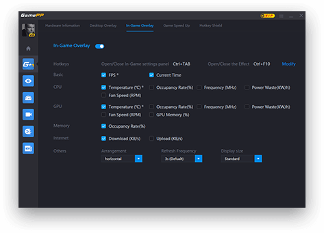 在游戲內(nèi)顯示電腦硬件的當(dāng)前信息,不僅可以顯示FPS,還可以顯示CPU、GPU、內(nèi)存、硬盤的當(dāng)前數(shù)據(jù),更全面地了解游戲時(shí)電腦當(dāng)前地運(yùn)作狀況。同時(shí),無論是更改你當(dāng)前想要顯示地信息,或是調(diào)整畫面優(yōu)化方案,或是更改錄像設(shè)置等,都可以在游戲內(nèi)呼出操作界面進(jìn)行更改。